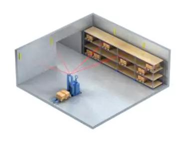 激光导航(图8)一般就指基于反射板定位的激光导航,具体原理是在AGV 行驶路径的周围安装位置精确的反射板,激光扫描器会安装在 AGV 车体上。激光扫描器随 AGV 的行走, 发出激光束,发出的激光束被沿 AGV 行驶路径铺设的多组反射板直接反射回来,触发控制器记录旋转激光头遇到反射板时的角度。控制器根据这些角度值与实际的这组反光板的位置相匹配,计算出 AGV 的绝对坐标,基于这个原理就可以实现非常精确的激光导引。