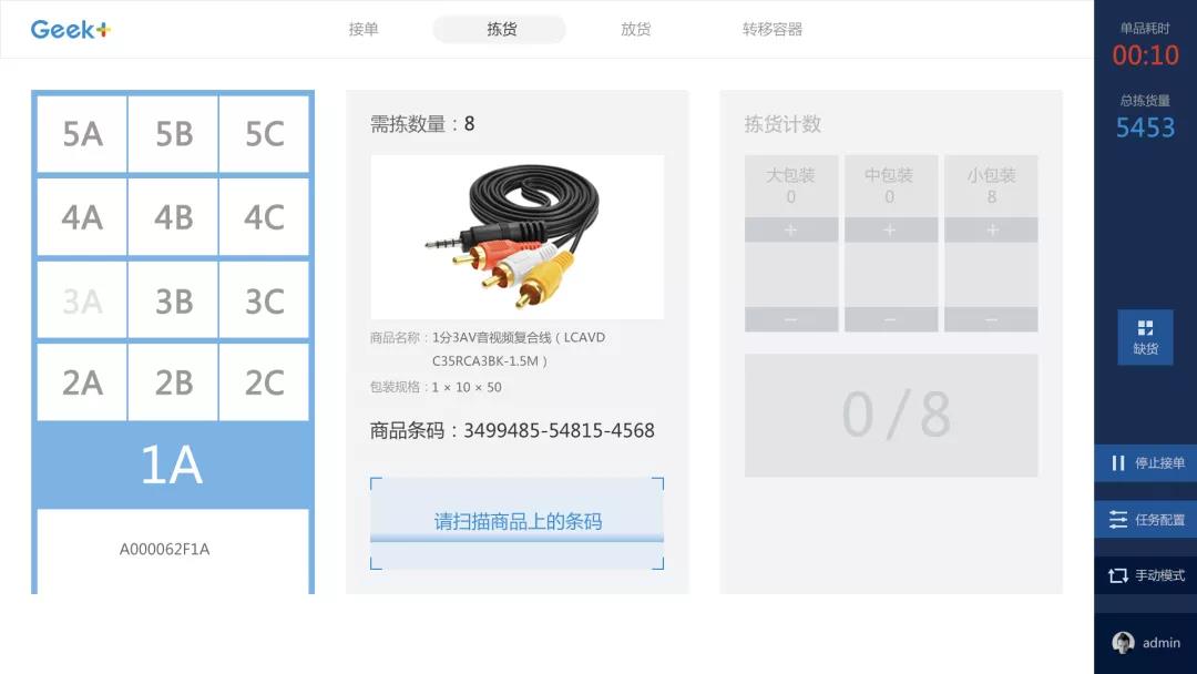 除了机器人和货架的高效调配,“智慧大脑”还让人机互动更简单高效。直观可视化的触摸式指令界面,操作人员无需复杂的培训,通常5分钟即可上岗,还可借助镭射指引、电子标签、RF等一系列技术,大幅提高拣货速度与准确率。