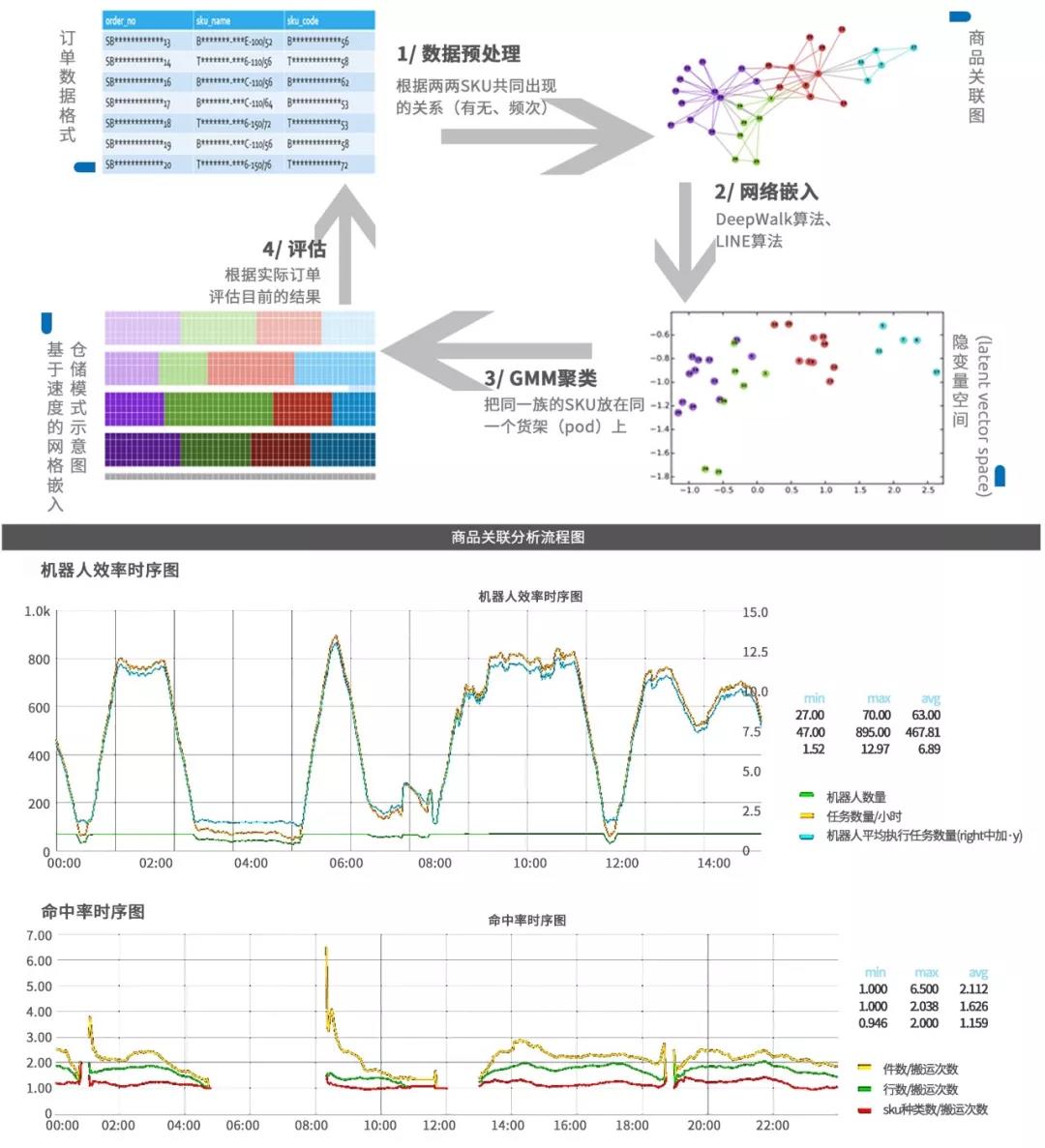 通过人工智能算法进行商品关联度分析、热度分析、波次优化等,优化库存存储,实现智能理货,提高货架命中率并缩短搬运距离。