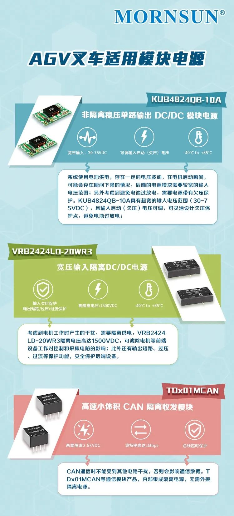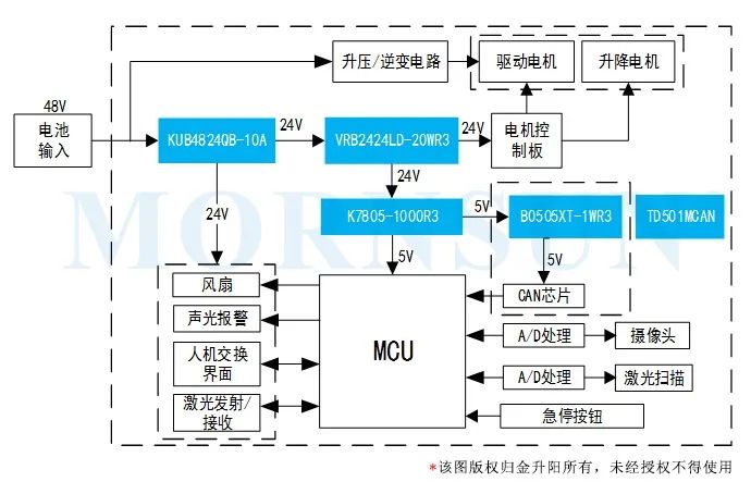 叉车机器人通过电池供电,依靠电机带动叉车行驶,而电机一般直接用蓄电池/锂电池供电,大部分模块供电没有严格的隔离要求,同时为了避免电池电压波动的影响,一般需要一个非隔离的大功率电源进行稳压。另外,考虑到电机转动的时候会产生干扰,所以对系统后端关键控制板卡类的供电,比如导航、安全等系统,一般需要采用隔离的方案,以保证系统稳定可靠的运行。