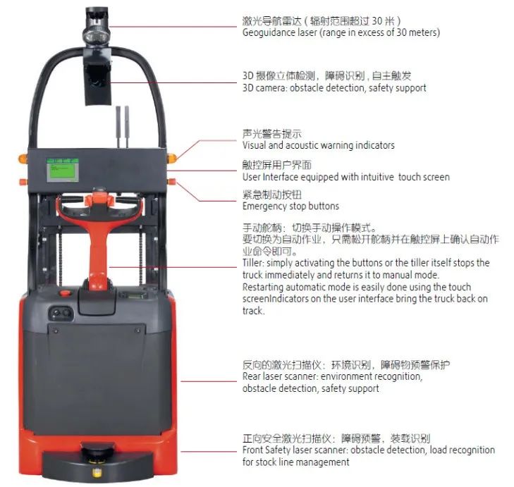 AGV叉车机器人由调度系统进行实时监控及任务指派,通过特殊地标导航自动将物品运输至指定地点,最常见的引导方式为磁条引导,激光引导,RFID引导等。以激光导航为例,在AGV行驶路径的周围安装位置精确的激光反射板,AGV通过发射激光束,同时采集由反射板反射的激光束,来确定其当前的位置和方向,并通过连续的三角几何运算来实现AGV的导航。AGV叉车机器人主要由导航系统、车载控制、驱动总成、能量系统以及安全系统组成。如下图1为比较典型的AGV叉车机器人,其形状相似于传统的叉车,并且可以实现自动作业及手动操作模式的切换。