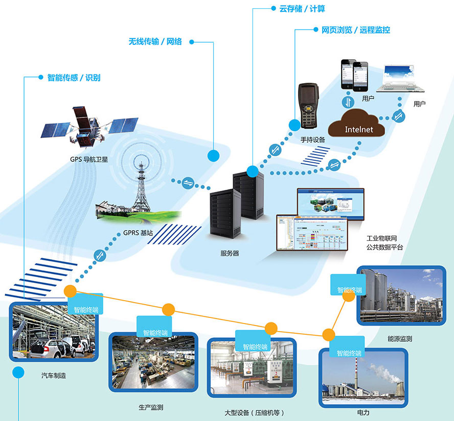 产品设备监控管理:各种传感技术与制造技术融合,实现了对产品设备操作使用记录、设备故障诊断的远程监控。
