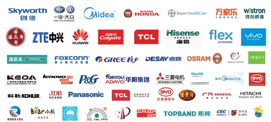 创维、一汽大众、美的、广州本田、拜耳制药、万家乐、纬创资通、潘高寿、中兴、华为、高露洁、TCL、海信、FLEX、vivo、屈臣氏、富士康、格力、德赛、欧司朗、OPPO、溢达、科达洁能、联想、宝洁、华阳集团、三菱电机、立白、美的空调、比亚迪、科勒、加多宝、松下、TCL、陈李济、广汽、日立、小熊、欣旺达、拓邦、深科技、新科、达意隆、安能、新宝电器、天弘科技、精艺股份、海信、顺威、泰科、Welling等等。