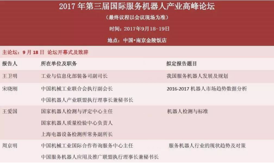 在成功举办前两届国际服务机器人产业高峰论坛的基础上,第三届国际服务机器人产业高峰论坛定于2017年9月18-19日在南京金陵饭店继续举办。从第三届论坛开始,组委会将成立论坛指导小组及专家委员会,并提出“国际化、专业化,市场化”的战略,将会使论坛的生命力更加强劲,更接地气。