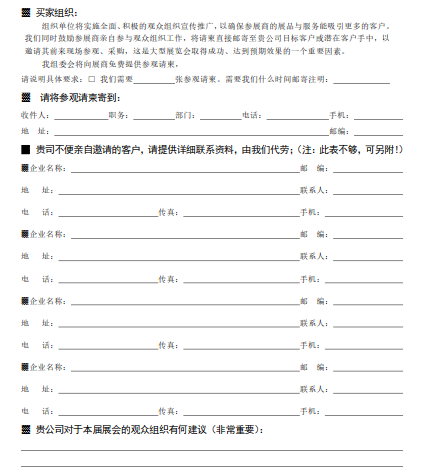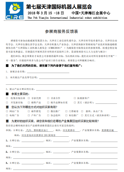 天津国际机器人展的主办方——振威展览,专注于展会的观众组织工作,认定观众是展会成功的基石,并经过多年累积,形成了超过30万余条专业观众数据库,为展商提供精准专业观众组织和对接服务。天津国际机器人展的专业招商部门,启动全球买家计划,在全球范围内进行“一对一”买家邀请,为此专门制定了参展商调查表(如下图)。
