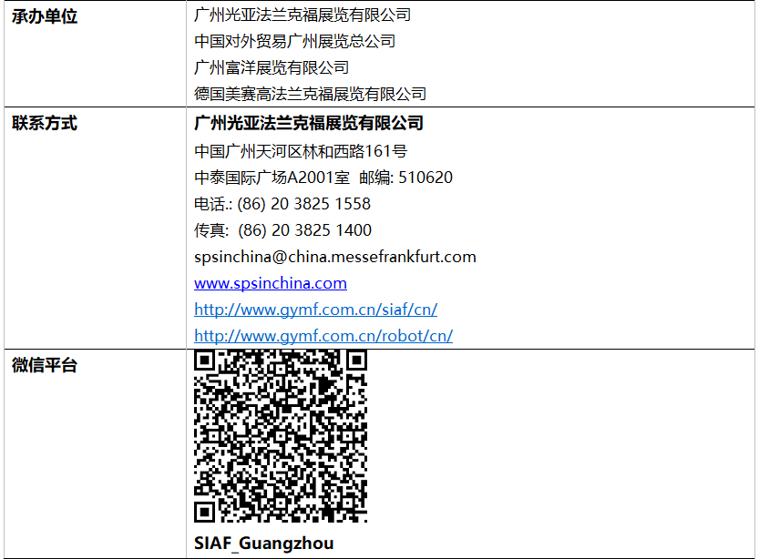 广州国际工业自动化技术及装备展览会(SIAF)是德国纽伦堡SPS IPC Drives电气自动化展会在亚洲的系列展。凭借法兰克福展览的办展经验及与其他品牌技术展的资源整合利用,以及各合作方的努力和支持,展会屡创佳绩,国际化与专业化程度不断提高。自举办以来,展会成功为观众带来更多国际性品牌,并广纳德国业内专家意见, 举办一系列揭示行业发展的高端研讨活动,助业内人士了解国际领先技术,推动行业发展。
