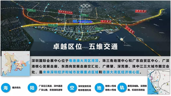 从区位上看,深圳国际会展中心地处粤港澳大湾区湾顶,广佛肇、深莞惠、珠中江三大城市圈交会处,广深港核心发展走廊、东西向发展走廊交会处,紧挨广深沿江高速,毗邻空港、轨道等交通枢纽,区位交通极其便利。