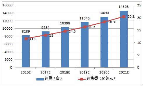 随着技术的进步和应用规模的扩大,医用机器人的平均售价将会有所下降,假设销量按照年均15%增长,售价约120万美元/台计算,至2021年,医疗机器人销量将超过3900台,其销售额将在48亿美元左右。
