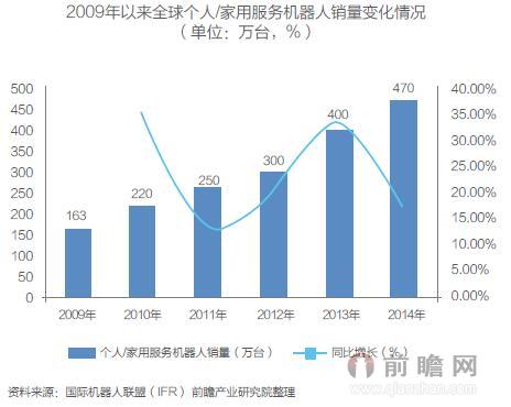 据统计,2012年全球个人/家用服务机器人销量约为300万台,较2011年增长20%,销售额为12.21亿美元;2014年全球个人/家用服务机器人销量约为470万台,较2013年增长17.50%,销售额约为22.5亿美元。