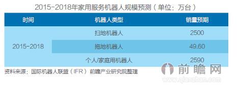 根据IFR的数据预测,2015-2018年,未来清洁机器人会首先打入家庭市场,扫地机器人的全球销量将达到2500万台,拖地机器人的销量会达到49.6万台。未来三年内,个人/家庭用服务机器人的全球销量将高达2590万台,市场规模高达到122亿美元,超过2014年市场规模的5倍。
