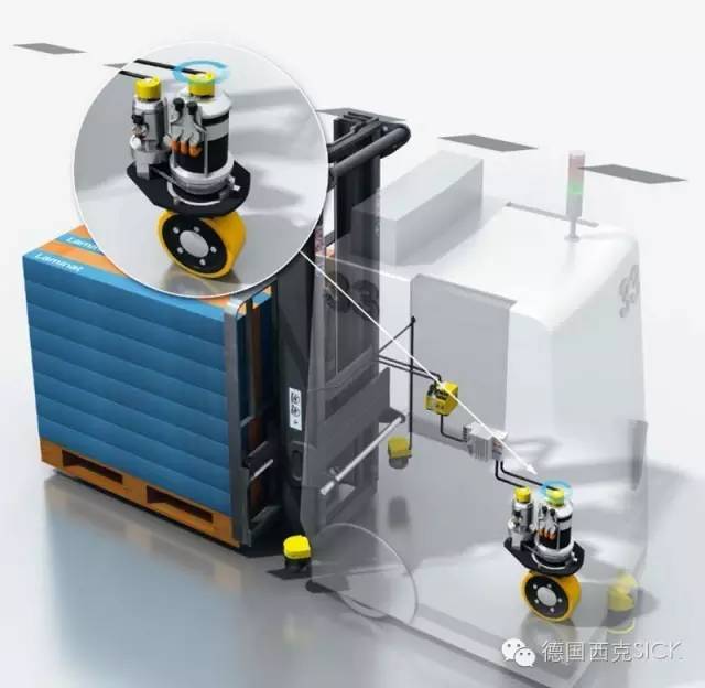安全编码器 DFS60S Pro 安装于AGV的驱动轴上,能够对安全功能提供支持,例如SSM(安全速度监控)和SLS(安全降低速度)。通过编码器与控制器之间的配合,控制器会根据需要降低AGV的速度。通过驱动监控功能 SBC(安全制动控制)和 SS1(安全停止 1)或 SS2(安全停止 2)可实现 AGV 的急停和安全监控。此外,安全编码器 DFS60S Pro 还可以作为可靠的信号发射器,为具有复杂导航要求的自动导航车提供信号。更加自由的移动是 AGV的发展趋势,这也是安全运动监控所面临的挑战。带有差分驱动的运输车将拥有两个独立的驱动单元。这样就可实现原地转向等操作。如果不使用经过安全认证的编码器,要实现这样复杂的流程就意味着必须在控制技术方面完成大量的工作。而经过认证的DFS60S Pro 能够轻松可靠地检测行驶方向和速度,以确保安全的移动。这样一来就可以设计出独立且互不干扰的驱动配置。