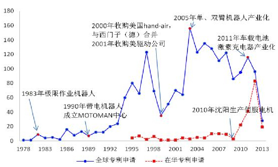 产品,而最近2年生产的机器人3万多台,超过了其他的机器人制造公司。2005年4月,该公司宣布将投资4亿日元,建造一个新的机器人制造厂,该公司每月工业机器人生产能力将达到2000台。安川公司在全球申请的机器人相关专利4505件,去掉重复的同族专利为1949项同族专利。