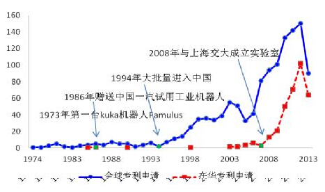 焊接机器人智能化与工程应用联合实验室”。KUKA公司在全球申请的机器人相关专利2383件,去掉重复的同族专利为802项同族专利。