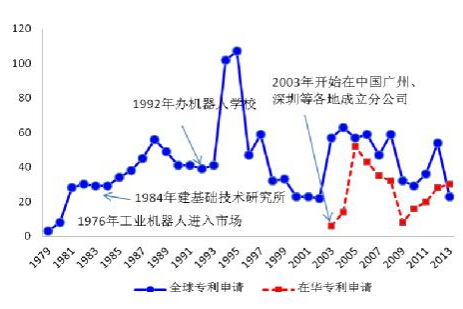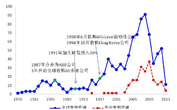ABB公司,自上世纪70年代中期开始了全球专利布局,并且逐年上升。同时,“中国增长”让全球领先的工业