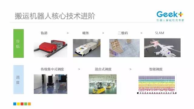 在物流机器人的核心技术进阶上来看,导航技术和调度技术的进阶升级最具有代表性。导航技术历经了轨道式导航、牵引式导航、二维码导航、SLAM导航(即使定位和地图构建)的发展轨迹,而调度技术也历经了传统集中式调度、混合式调度、智能调度的发展阶段。