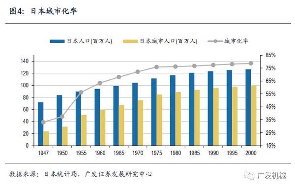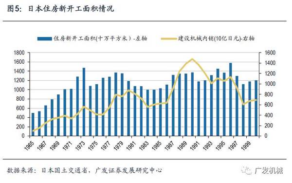 从整体上看,这一阶段有几个明显特征:(1)日本城市化率逐步提高,1950-1975这二十年期间城市化水平从37.5%提升至75.9%,年均增长2.9%。与之相对,1990-2015这二十五年的城市化率年均增长仅为0.7%;(2)住房新开工面积与工程机械内需量呈相同波动趋势;(3)每一次政策刺激都对应一个工程机械的景气周期。日本在1955-1990年这段期间有五个景气周期。
