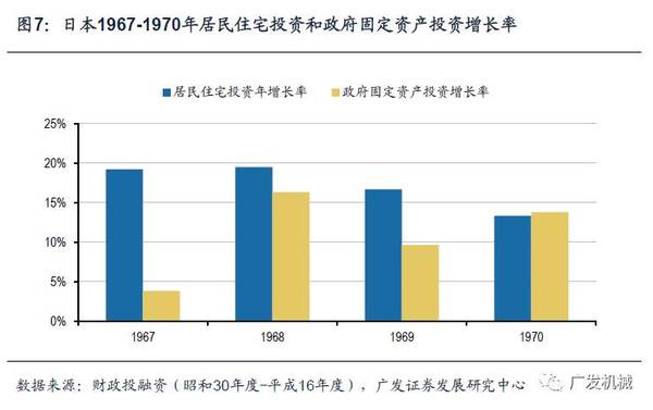 1965-1970年,第二个景气周期。这一阶段的日本,基础产业有了一定积累,产业结构开始转型升级。转型升级之际,1965年发生经济萧条。在货币政策失效的情况下,政府采取了更加激进的政策刺激经济,发行“赤字国债”。1965、1966两年共融资6656亿日元,主要用于各项基础设施建设。而在住宅方面,1966年实施了《第一期住宅五年计划》,其中公共投资270万户,私人投资400万户,掀起了民间房建热潮。这也是日本住宅投资上,私人投资比例高于公共投资的开端。1967-1970年,居民住宅投资年增长率分别达到19.2%、19.5%、16.7%和13.3%;政府固定资产投资在大规模基建项目的刺激下,年增长率为3.8%、16.3%、9.6%和13.8%。在这种基建、住宅双带动的情况下,工程机械迎来了一个长达五年的需求增长期。