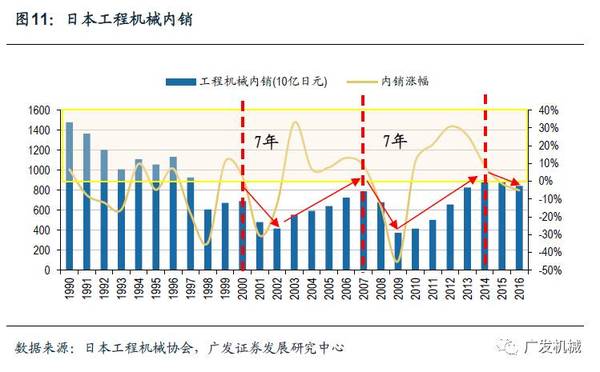基建与住宅的稳定发展,说明对工程机械行业的需求走向稳定,行业的增长将主要由于设备的更新需求。日本工程机械内需于1998年从下降转为平稳,说明多余的需求逐步完成出清。2000年为平稳的最后一年,内需处于一种饱和状态。2007年、2014年高点出现,达到更新的峰值。据此推论,日本工程机械行业已经形成时长为七年的完整周期,2000年、2007年、2014年为量最大的更换年。
