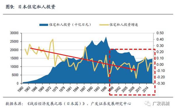 1991年日本“泡沫经济”崩溃,国内需求开始萎缩,1998年亚洲金融危机达到低点,日本经济陷入低迷。而1990年,日本城市化水平达到了77.34%,基建对经济的拉动系数有所降低。日本公共需求走向平稳,保持在120-130万亿的区间,缺乏增量空间的公共需求从另一侧面证实基建对经济的拉动作用大大减弱。与此同此,公共投资占GDP比值一路走低,自2003年开始平缓。对房地产的投资热潮也逐渐退去,私人住宅投资(占总住宅投资95%左右)走向平稳,年增长率基本低于5%并且多年处于负增长状态。多种指标表明日本基建、住宅情况已经步入稳定期,告别投资拉动的时代。作为与基建、住宅连接紧密的工程机械行业,也走向新阶段,步入成熟发展期。