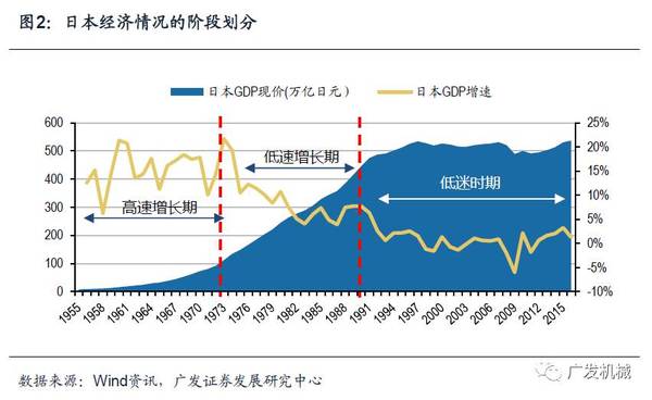 战后日本经济根据GDP增速变化分为四个阶段:1945-1955年为经济恢复时期;1955-1973年为经济高速增长时期,1973-1990年为经济低速增长期,1990年至今为经济低迷时期。在经济增长期,日本逐渐完成城市化,各产业先后蓬勃发展。工程机械伴随着经济增长呈阶段性上升的特征,国家每次的大规模刺激内需的政策都带来工程机械行业热潮。而在经济低迷时期,日本经济虽然基本停滞,但已经达到极高的水平,各产业发展已较为完善,政府投资、内需都较为平稳,使得工程机械行业也进入成熟发展期,呈现出周期性变动的趋势。据此,我们将日本工程机械行业发展分为两个阶段,第一阶段为投资导向阶段(1955-1990年),第二阶段为成熟变动阶段(1990年至今)。
