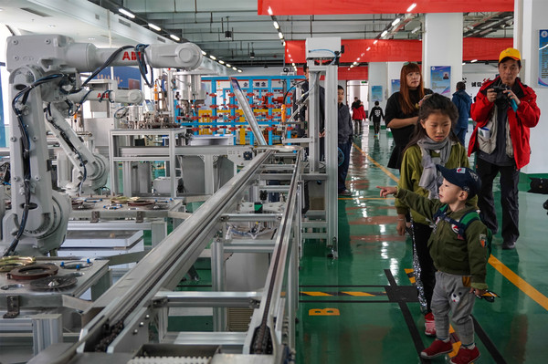 生产线机器人灵活的机械手臂让孩子们颇为惊奇。搬运、摆放、压模、质检,每一道工序都一丝不苟。