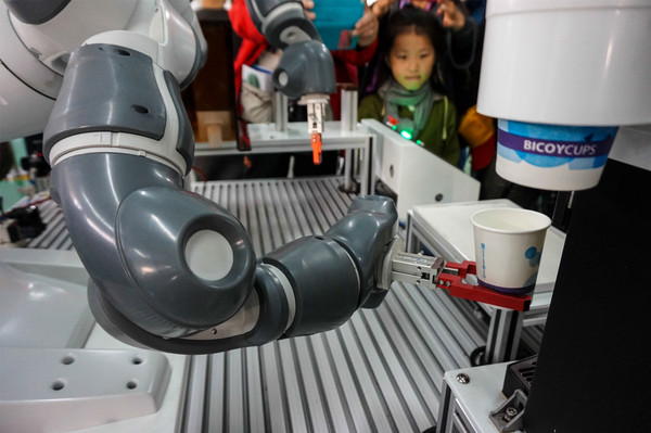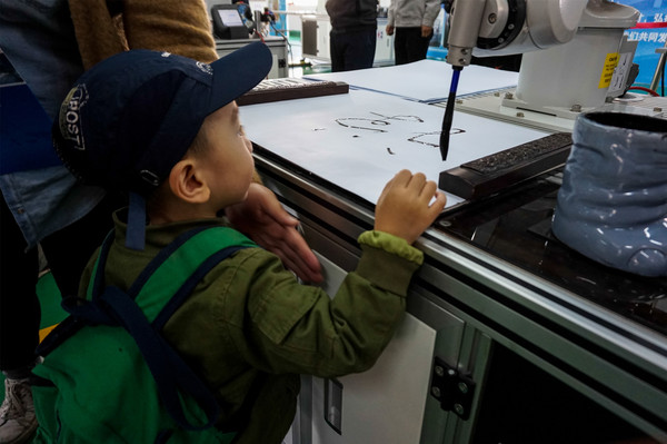 虽然书法机器人还无法掌握书法者笔触力道的神韵,但仍获得了参观者们的青睐,大家纷纷前来尝试。就连小朋友都看呆了,想去摸摸机器人的“手”。