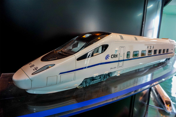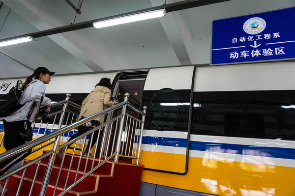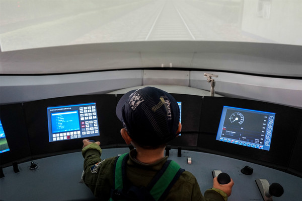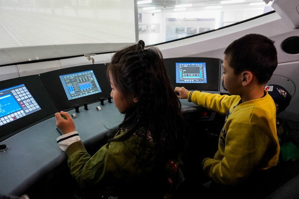同行的大朋友和小朋友进入动车体验区,尝试动车的模拟驾驶。