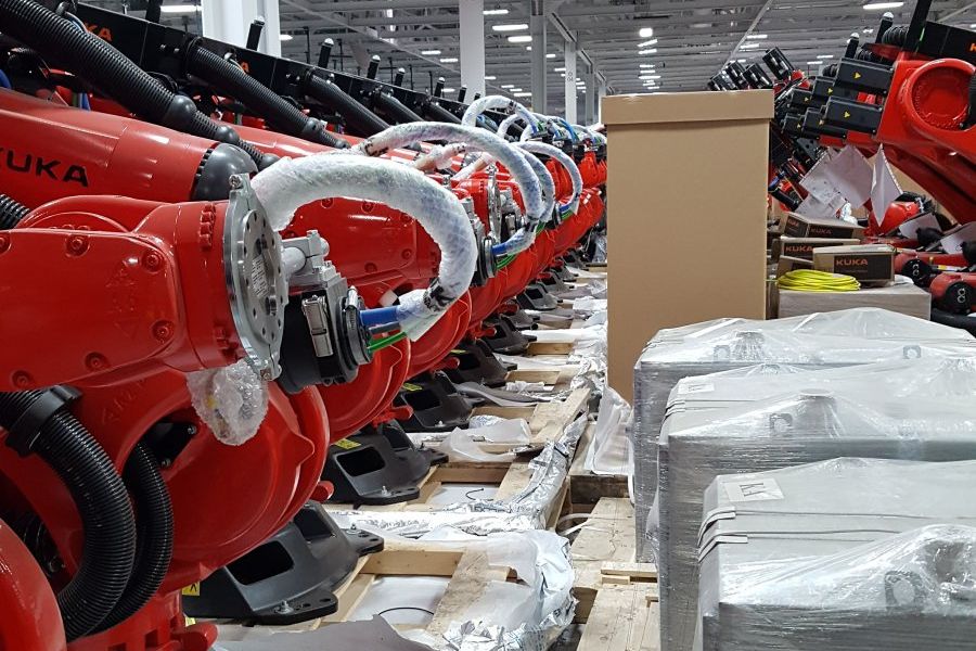 网易科技讯 4月27日消息,据国外媒体报道,早在2014年特斯拉就在Model S电动汽车生产线上采用了机器人。据悉,这些机器人由德国工业制造商Kuka Robotics开发,同时也应用于Model X以及特斯拉电动汽车的电池组生产线。而近日,有SoanTraders论坛用户发帖声称自己是Kuka Robotics的现场服务工程师,其上传的照片显示出Kuka Robotics机器人准备出货。