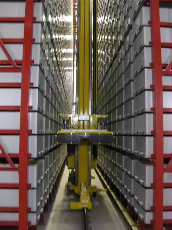 这是最初的最简单的系统,中间一个crane(中文貌似是堆垛机),可以前后移动,中间那个buffer可以上下移动,所以这一列的所有箱子都能拿到。京东视频里的也是用的这个,现在在中国比较流行。