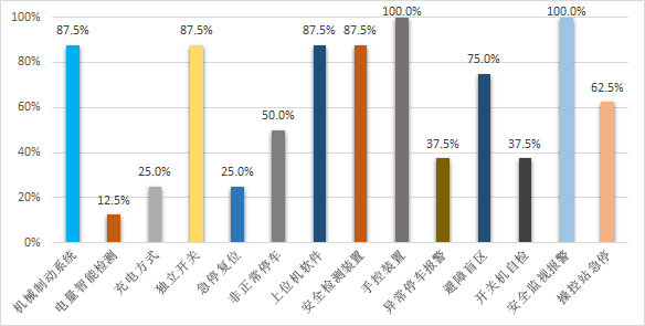 安全装置上,所有产品未配备专用合格的手控装置,并在超速、超载等异常状态时无闪烁灯和声音报警功能;87.5%的产品存在障碍物安全检测盲区,且未采用机械制动系统,安全风险较高。