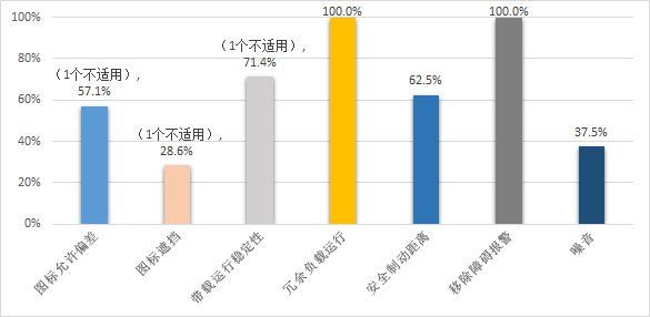 性能上,一方面71.4%的产品带载运行稳定性差,在货架位置发生偏移或货物摆放位置不均的情况下出现无法举升货架或行驶轨迹偏移等严重问题;另一方面,62.5%的产品在1m及以上距离检测到障碍物未能及时减速停止,障碍物离开后无声音报警。