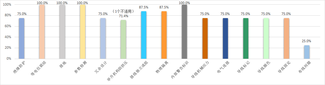 机械电气安全方面,结果显示有三大问题。其一在控制电路上,所有产品的速度、压力、位置等限值检测装置不完善,75%的产品未采用完整的冗余技术,容易引发失控现象;其二,电气隔离防护上75%的产品绝缘防护措施不规范;87.5%的产品电气系统和非电气系统未采取物理隔离措施,动力线、控制线未独立成组;第三,导线配线上,75%的产品存在导线和电缆存在机械应力过大和弯曲半径过小、电气连接不牢固、导线标号、颜色、固定方式不规范等问题;25%的产品导线靠近运动部件的距离过小,缺乏防护装置。