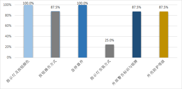 基本参数上,测评结果显示,所有产品指示灯颜色混乱,25%的产品指示灯安装方式存在失效风险;87.5%的产品按钮位置和颜色容易产生误操作,并且未安装警告安全标识和铭牌;87.5%的产品外壳未能达到规定的防护等级,存在安全隐患。