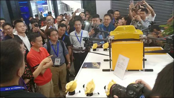 据价值兄了解,苏宁物流当天在现场展示了一台大载荷多旋翼的无人机,4轴8旋翼,配置8个1500w的大电机,提供足够的动力,最大载重15Kg。这金灿灿的大家伙,引来嘉宾云集,其中包括马云爸爸都开始围观了苏宁的无人机。