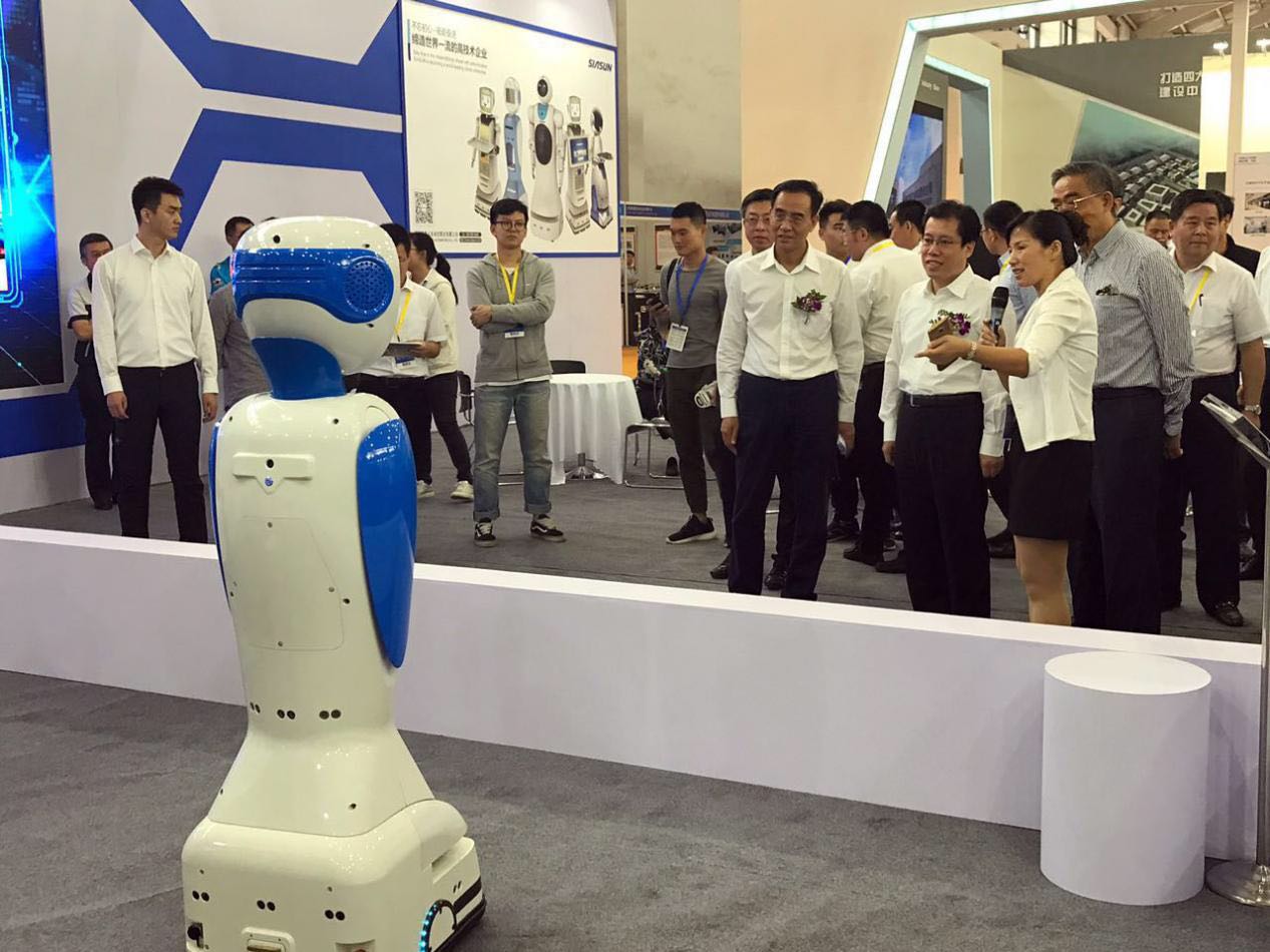 沈阳市市长姜有为在现场了解新松机器人展出的服务机器人