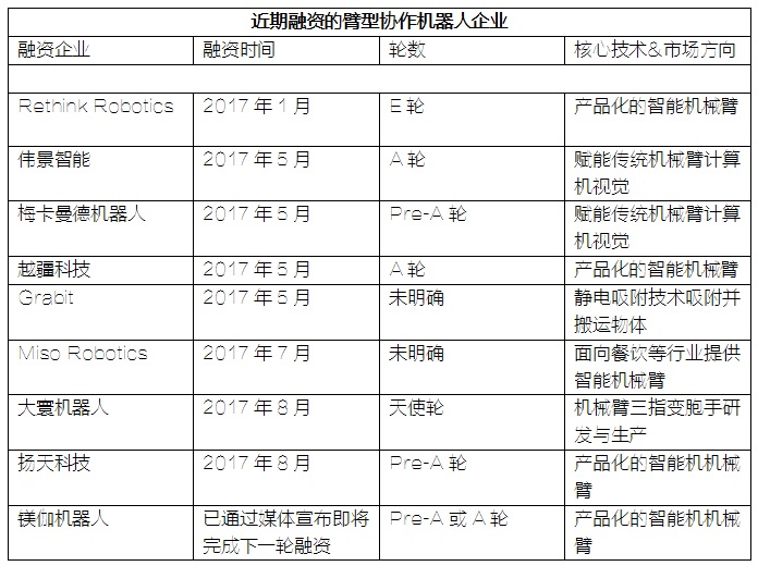 以来,初创型协作机器人公司,迎来融资的小高潮。这些企业大多从事智能化臂型协作机器人的自主研发,或为传统臂型机器人提供智能升级或精细化作业的能力,其中大多数公司都是年轻的初创企业。