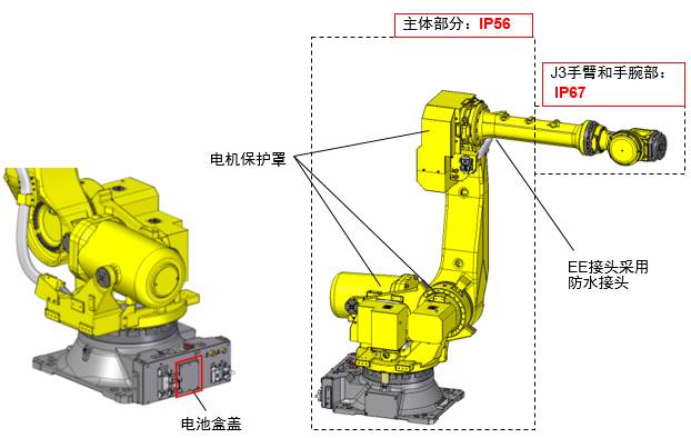 FANUC浇铸版机器人表面及空腔内均涂覆了特殊防高温剥落涂层,外露螺栓和垫圈采用防锈材质,机器人马达电机等敏感区域采用特殊的罩壳配合密封垫圈对其进行保护,增强了在恶劣环境中的防尘、防水性能。