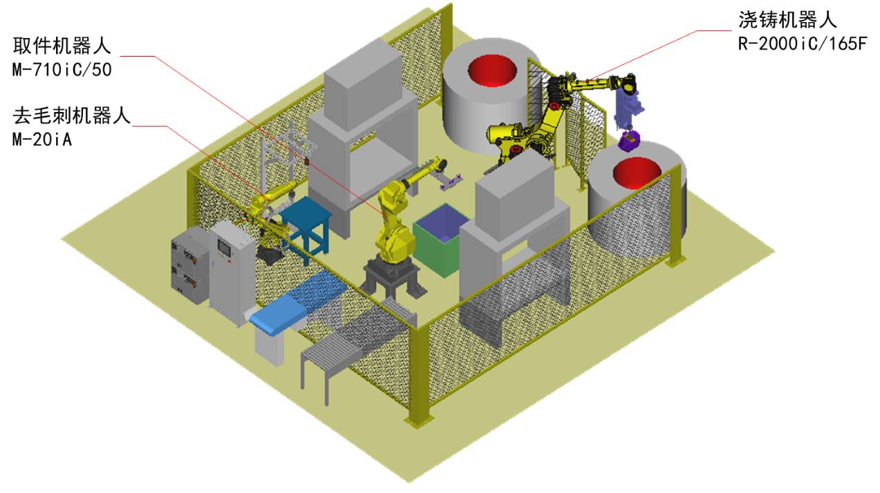 FANUC开发的机器人全自动化浇铸系统,不仅可以实现机器人自动舀铝液、浇铸,还可实现砂芯上料、去毛刺,取件、淬火、切冒口等全自动化工序。