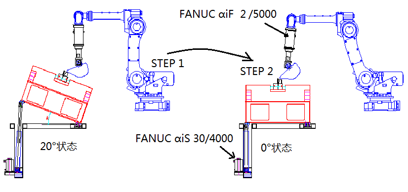 例如,机器人在向铸造机的浇口中注入铝液过程中,铸造机从模具上平面与水平面成20°角的姿态匀速转动至水平状态,机器人在浇铸的同时需要能够同步跟随铸造机运动,示意图如图3所示。