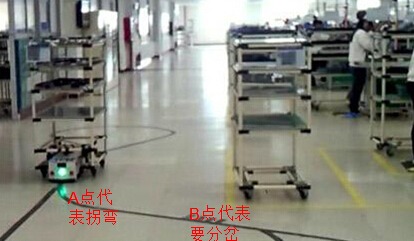 AGV通过PLC控制,小车载有无线通信系统,可以和上位机进行无线通信,报告自己的运行位置和工作状态,执行上位机的指令,把工作节拍和工作量及时传递给上位机;AGV通过RFID读取地面标识,做出相应的动作(改变速度、转向、定位和停车等);AGV车身底部装有AGV读卡器JY-L8900,地面的节点位置安装有RFID地标卡JY-T330,并赋予每个节点上的地标卡一个ID号和定义,比如节点A处代表AGV要拐弯,用ID号00001表示,一旦运输车在经过A处时,AGV读卡器会读取A处的电子标签ID号,PLC根据读取的数据,使小车作出相应的动作,从而实现AGV调度系统功能、站点定位功能。如图: