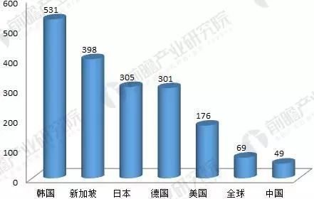 图表2:世界各国制造业工业机器人密度比较(单位:台/万人)