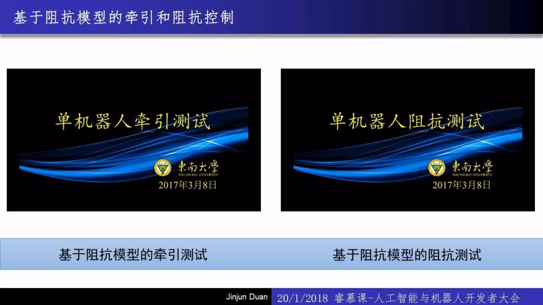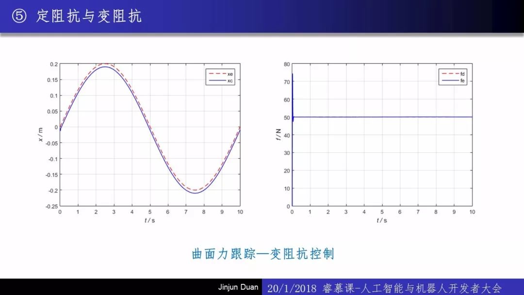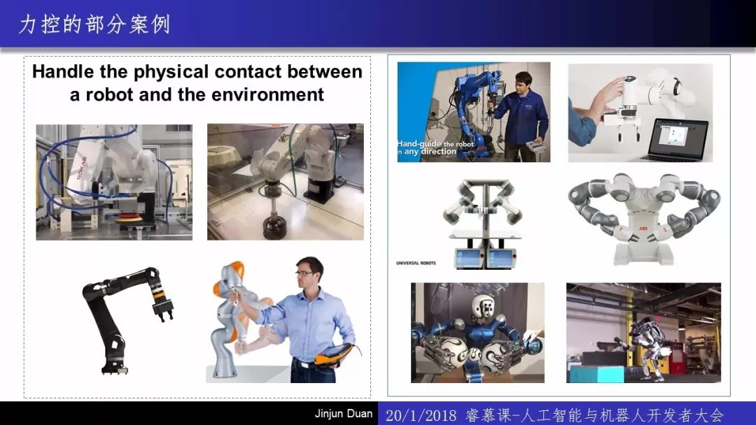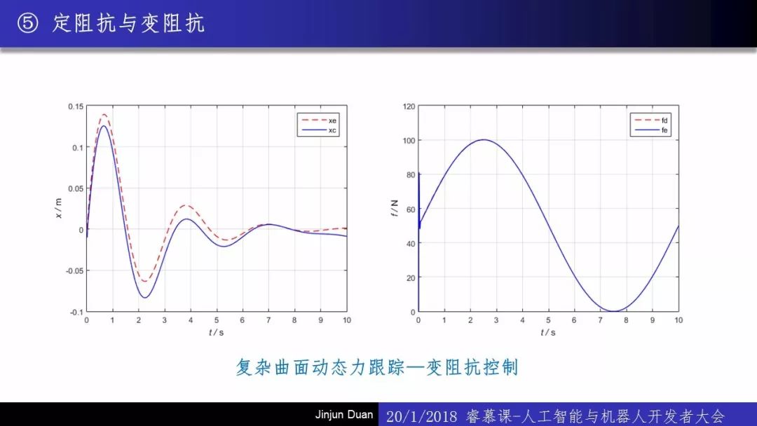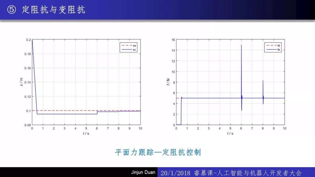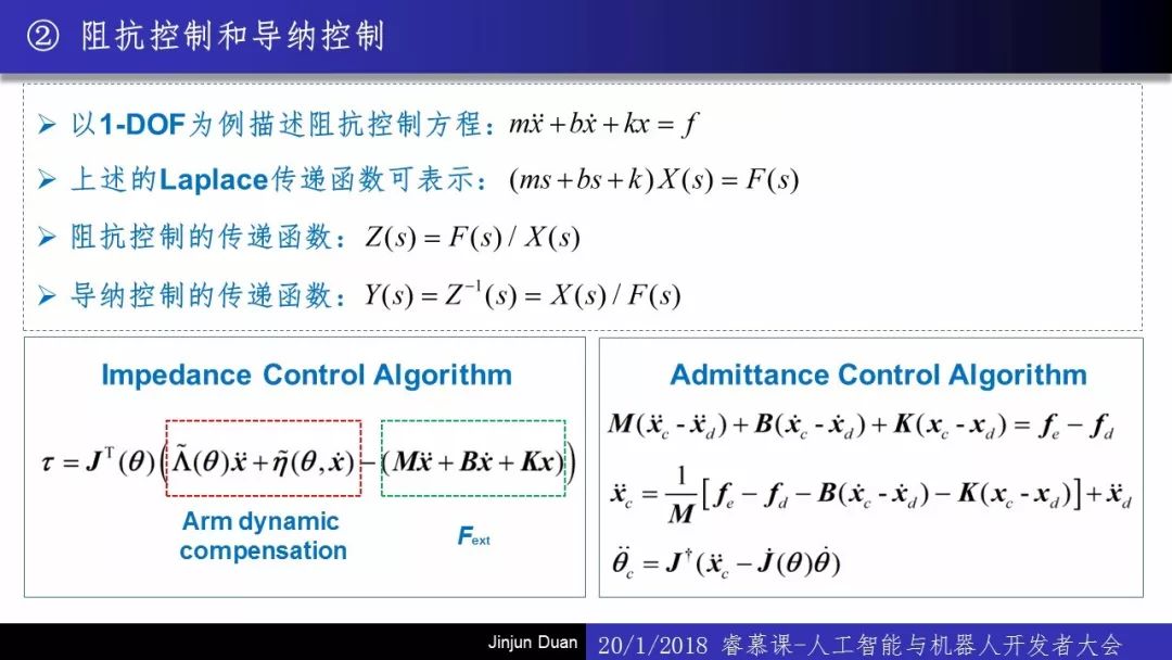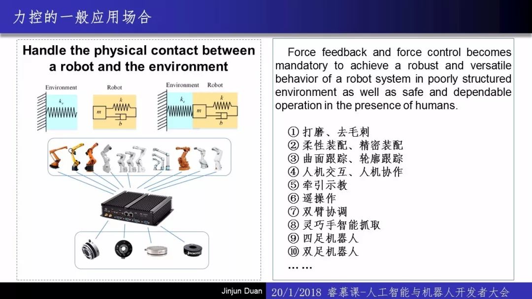2018年1月20日,段晋军博士在 睿慕课·2018 人工智能与机器人开发者大会 上进行了技术演讲,主题为《 浅析阻抗控制在机器人系统中的应用 》,阻抗控制在机器人系统中最重要的技术之一,段晋军博士在演讲中,详细的讲述阻抗控制和导纳控制的原理和区别,基于阻抗模型的牵引和阻抗控制、恒力跟踪和动态力跟踪、双臂位置力协调控制,给大家讲述完整的阻抗控制知识体系和案例应用,参会人员纷纷表示获益匪浅。