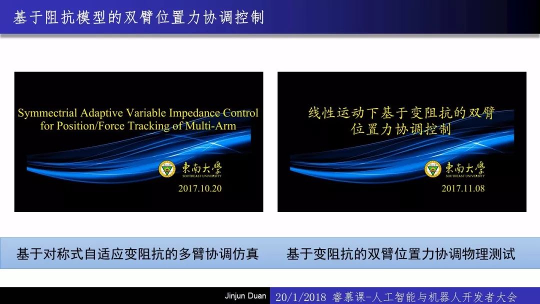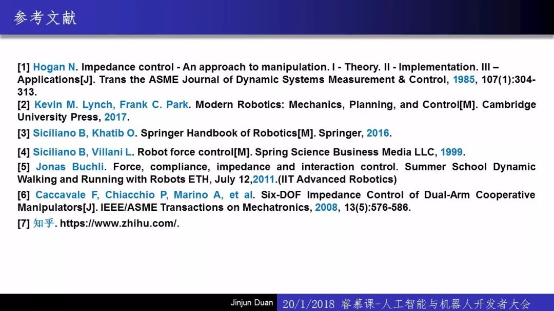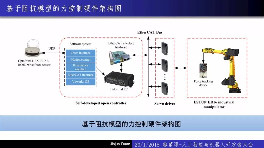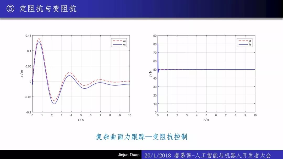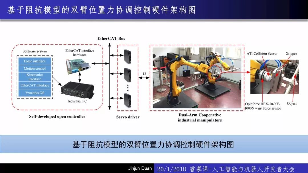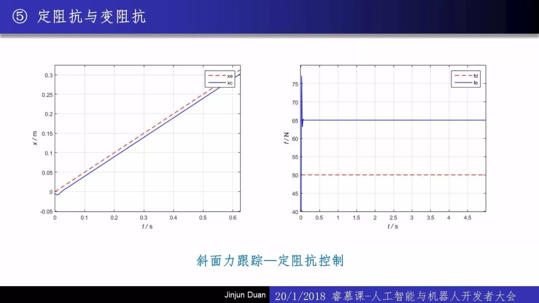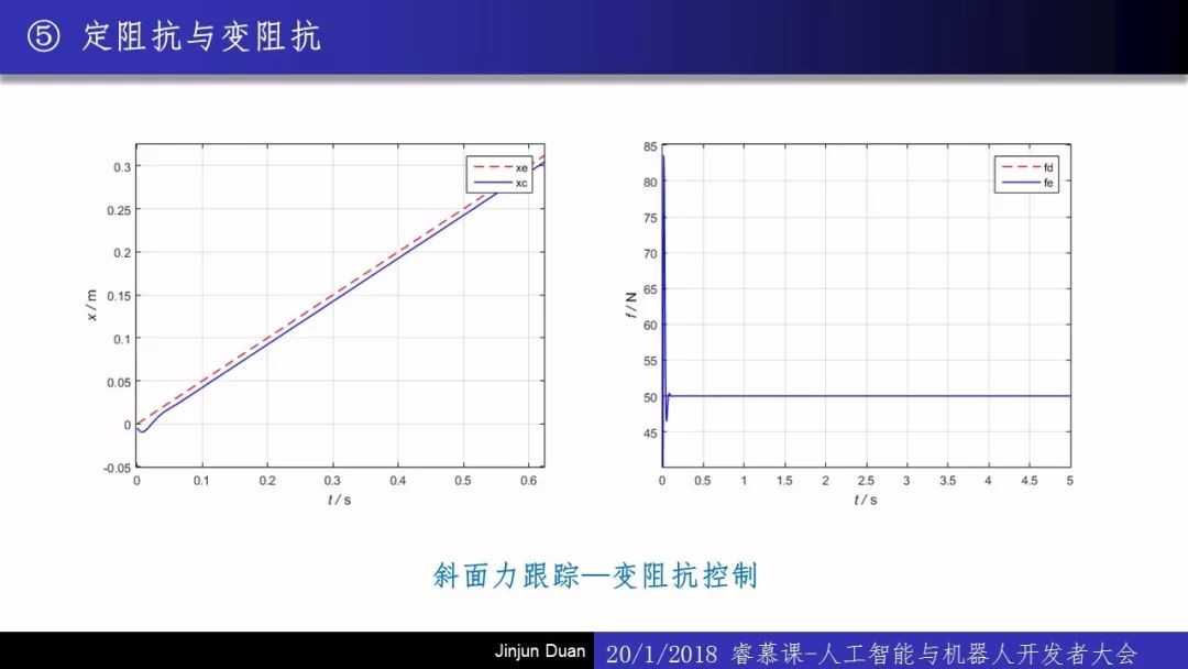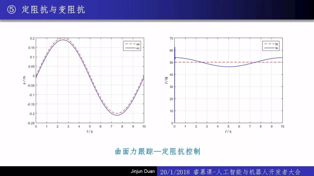2018年1月20日,段晋军博士在 睿慕课·2018 人工智能与机器人开发者大会 上进行了技术演讲,主题为《 浅析阻抗控制在机器人系统中的应用 》,阻抗控制在机器人系统中最重要的技术之一,段晋军博士在演讲中,详细的讲述阻抗控制和导纳控制的原理和区别,基于阻抗模型的牵引和阻抗控制、恒力跟踪和动态力跟踪、双臂位置力协调控制,给大家讲述完整的阻抗控制知识体系和案例应用,参会人员纷纷表示获益匪浅。