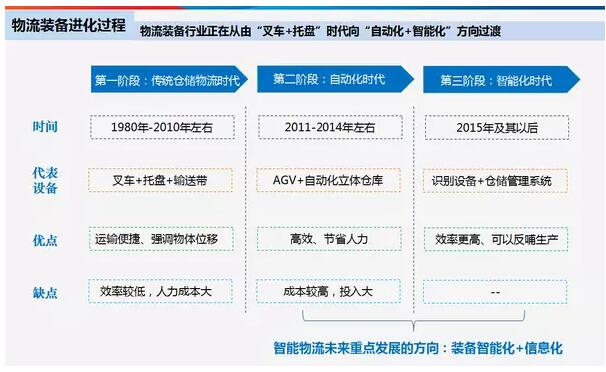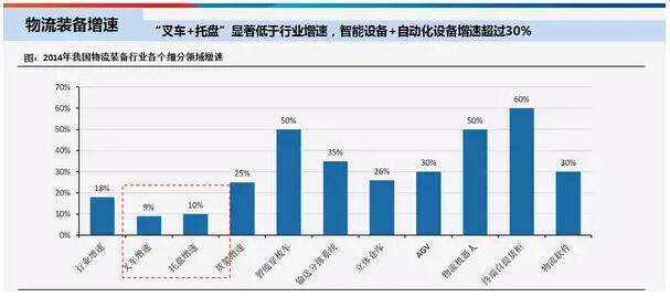 在智能物流装备所有的子版块中,叉车和托盘的增速大约在10%左右,低于行业平均增速10个百分点。其他智能化设备,包括智能穿梭车、立体仓库、AGV、物流机器人、拣选系统、软件等,增速都在30%以上。