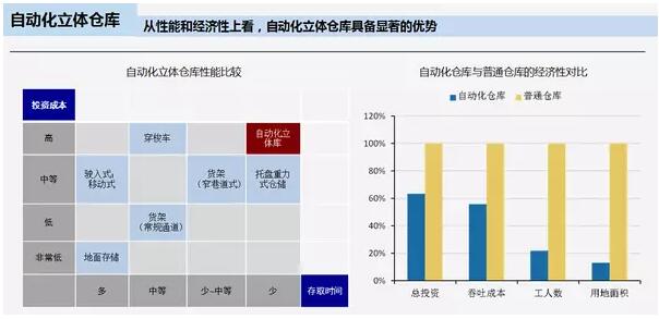立体仓库的性能优势主要体现在:存取时间比较少,效率更高,但是投资相对较高,穿梭车和堆垛机的投入成本也较高;从经济性上看,比普通平库在总投资、成本、工人和用地面积上具备优势。
