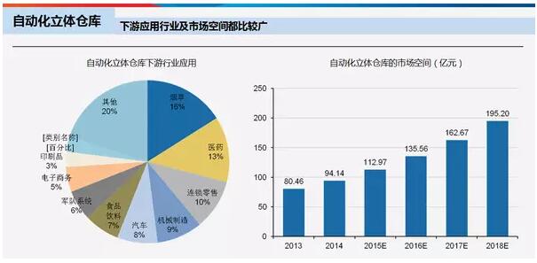 自动化立体仓库的下游需求比较分散,主要以烟草、医药、零售、机械制造等为主,行业之间有壁垒。自动化立体仓库的市场空间大约在150-200亿元之间。