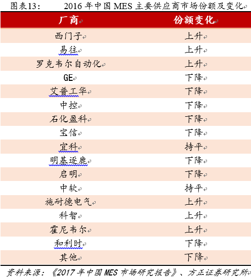 MES在发达国家已实现产业化,并出现了一批领军企业如西门子等,相比较国外MES市场,我国MES行业发展历程较短,市场刚刚兴起。国内相关企业目前普遍有规模较小,面向行业单一等特征,竞争力较弱,但另一方面,现阶段国内制造业企业中MES的使用率仍然较低,且相关软件的能力亦有所不足,市场潜在发展空间巨大,国内软件企业往往更接近上游工业企业客户,熟悉工业生产流程,且可以快速响应,提供优质的售后服务,通过借鉴外国先进MES厂商的先进经验,根据国内不同类型厂商的需求,专门研制符合我国制造业的MES系统,国内未来有望迅速崛起一批规模化、专业化的MES软件企业。