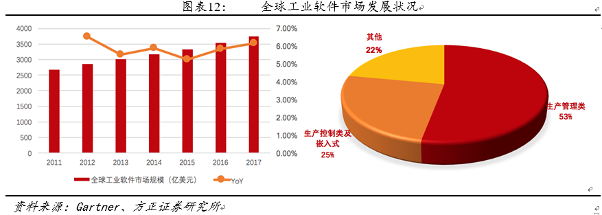 自2011年以来,全球工业软件市场规模以每年6%左右的速度增长。工业软件构成中主要以业务管理为类主,占比超过50%,生产调度及过程控制类和研发设计类各占约25%。