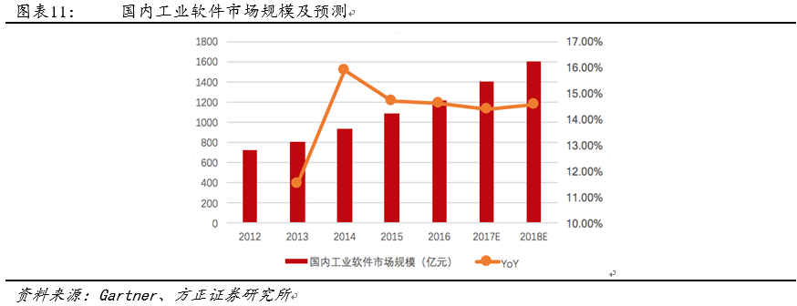 MES作为工业软件的核心部分,市场空间广阔,相关机构预测MES市场未来的复合增速可保持在40%左右。2014年全球MES行业市场规模约为416亿元,过去5年保持年均21.65%的高速增长,预计到2020年,MES行业市场规模有望达到931亿元,未来将保持年均18%的复合增速。2016年我国MES市场规模为25.82亿元,较2015年同期增长26.39%。预计2017年我国MES市场规模为32.04亿元,到2022年我国MES市场规模将达到77亿元左右。