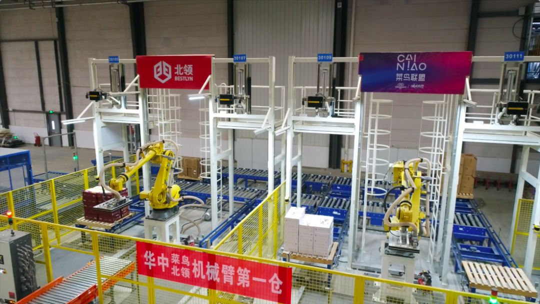 菜鸟武汉无人仓内,机械臂大力士在搬运大件商品